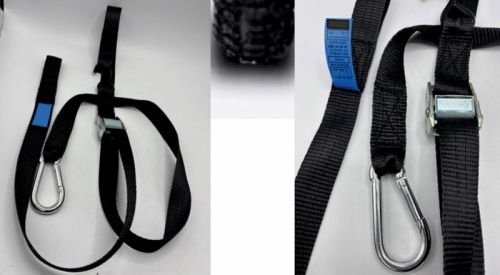 "Lot de 2 sangles moto 2 pièces 35mm noir longueur totale 2m10 avec levier de serrage robusteL=0.5m avec boucle de 6cm , l'autre côté pince 35mm + crochet en S fermé + L= 1m55 avec mousqueton 100x10 exécution professionnelle pour toutes moto's : motorcross - enduro - supermoto - quad - streetbikes - touringbikes etc"