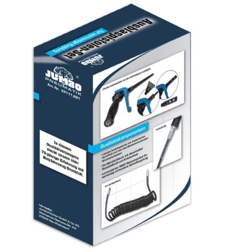 "Pour DAF XF105/XF105/XF2021->/XG2021->/XG+2021-> Pour Mercedes Actros MP4 / Mercedes Actros MP5 • Jeu de pistolets à air comprimé • Incl. Tuyau d'air de 5 mètres • Pistolet de soufflage robuste avec débit réglable • 3 embouts en plastique : pour les grandes surfaces, pour un travail précis et précis et un embout à air solide • Tuyau spiralé de 5 m avec force de rappel permanente et protection anti-pli avec fiche de couplage"