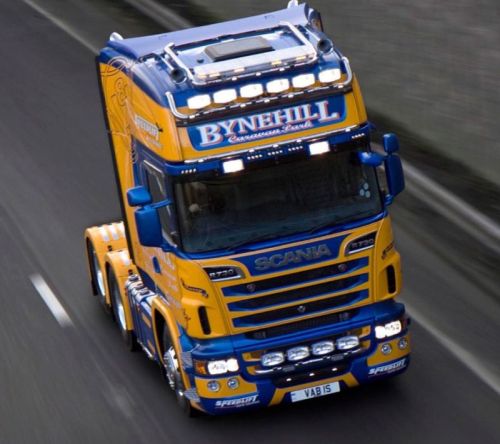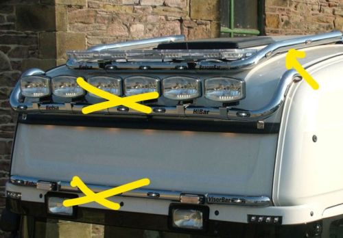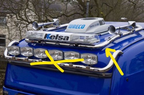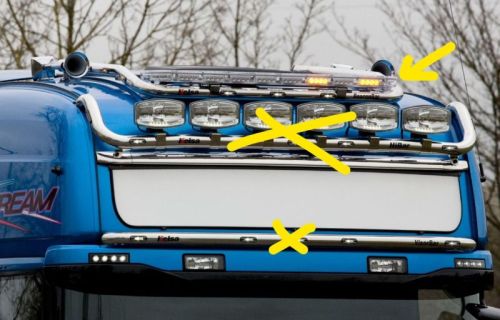 DERNIÈRE PIÈCE / 1 SEULEMENT disponible !!! -> S'adapte à Scania 4-serie Topline (2003->2007) / Scania Topline R1 (2007->2013 / Scania Highline+Topline R2 (2013->2016) • Aluminium peint NOIR • Ø60mm • 3 barres LED pré-câblées + 2 feux clignotants • 3 LED blanches intégrées en face • 2x2 LED orange côté • 2 lampes flash intégrées • 4 supports de montage noirs inclus • 2 plaques noirs de montage de gyrophares incluses • Phares et gyrophares NON inclus