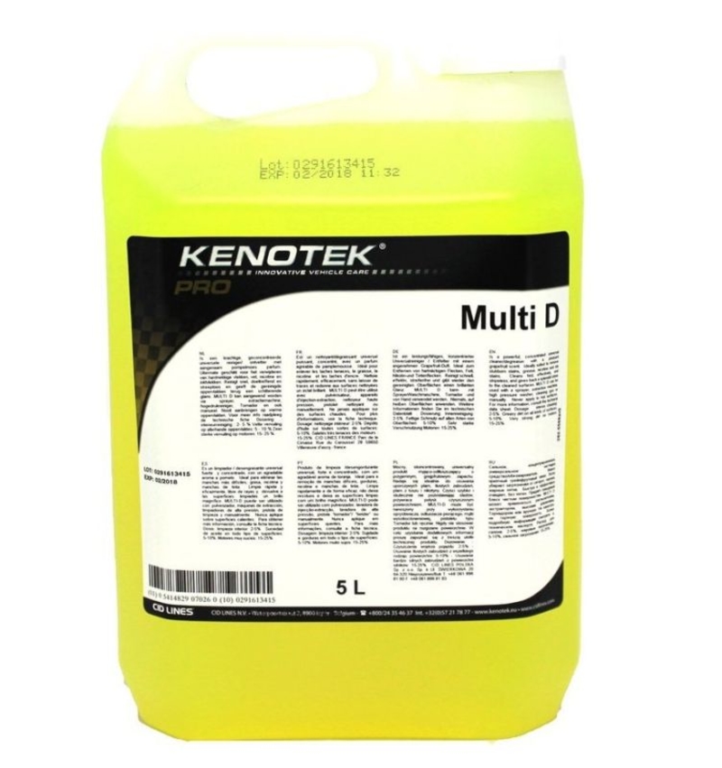 "Kenotek Multi D est un nettoyant et dégraissant universel puissant. Il élimine rapidement et facilement les saletés tenaces, la graisse, la nicotine et les taches d'encre. Caractéristiques : • Nettoyant et dégraissant universel puissant • Élimine sans effort la nicotine, l'encre, l'huile, etc. • Utilisation multifonctionnelle • Agréable parfum de pamplemousse • Kenotek Multi D peut être appliqué manuellement ou à l'aide d'un pulvérisateur, d'une machine d'extraction, d'un nettoyeur haute pression ou d'un canon à eau."