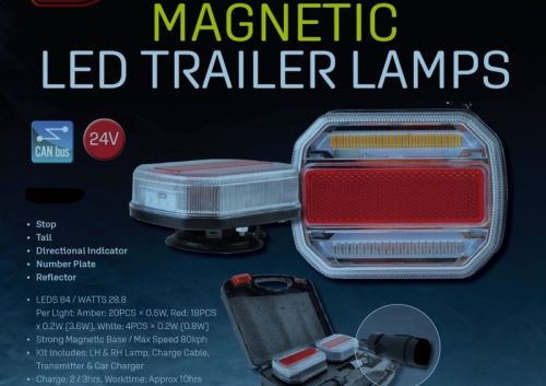 • 24 Volt • 84 SMD LEDs • Stop | Tail | Indicator | Number Plate | Reflector • IP65 Rated • ECE Approved Reg 3 | 4 | 6 | 7 |10 • PC Lens • ABS Body • Magnetic Mount • CAN Bus Transmitter • 118*93*64mm • Charge 2/3 hours // Worktime +- 10hours Kit Includes: • Left Hand Tail Lamp with Magnetic Base • Right Hand Tail Lamp with Magnetic Base • 7 Pin Transmitter Plug - Wireless Plastic N-type • USB Charging Cable • USB Car Charger Converter