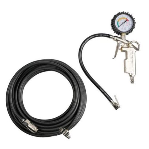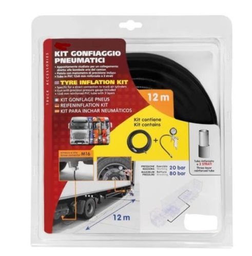 Direct connection to truck air cylinders. Gun with precision pressure gauge. 12x6 mm reinforced PVC tube with 3 layers. Tube length: 12 m M16 screw connector 20 bar kg/cm² working pressure. 80 bar kg/cm² maximum pressure