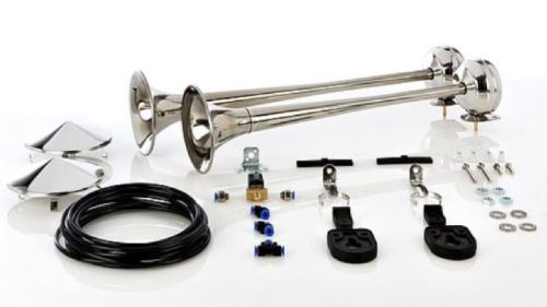 Jeu de claxons en inox d'une bonne qualité / Montage avec pression d'air! / 108dB / 2240g / E3 / 1x 65cm + 1x 70cm / Complèt avec kit d'installation et valve électronique 24V !