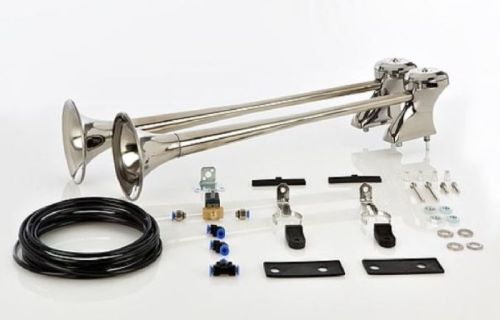 Jeu de claxons en inox d'une bonne qualité / Montage avec pression d'air! 108dB / 4176g / E3 / 1x 65cm + 1x 70cm / Complèt avec kit d'installation et valve électronique 24V !
