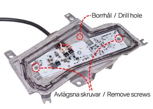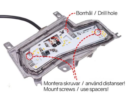 "Pour model Scania Next Gen JUSQU'A année de construction 2023 !!! Émetteurs à 18 LED lumineuses, spécialement développés pour les phares antibrouillard à LED Scania d'origine. Les émetteurs sont disponibles en blanc xénon, jaune et blanc chaud, éclairent tout le réflecteur des antibrouillards. La lumière n'est pas aveuglante et fonctionne comme des feux de position. La conception intelligente vous permet de conserver pleinement la fonction du phare antibrouillard. L'émetteur est placé au-dessus de l'émetteur existant pour le feu de brouillard. Les vis et les entretoises sont incluses et sont nécessaires pour le montage. Il y a 3 mètres de fil. Il y a un fil de 3 mètres sur chaque émetteur, qui peut être connecté au feu de position régulier. Il y a un fil plus et un fil moins. Bicolore Il y a 3 mètres de câble sur chaque carte. Il y a un moins et deux fils plus. Vous ne devriez jamais avoir les deux couleurs activées, vous devez donc utiliser un interrupteur à bascule pour passer d'une couleur à l'autre. La couleur stroboscopique standard est jaune Bicolore + flash Il y a un câble de 6 mètres sur l'émetteur avec des connecteurs M8, qui peut être connecté au contrôleur inclus. Le contrôleur gère les deux couleurs et les éteint automatiquement lorsque vous activez la lumière stroboscopique. Le contrôleur lui-même a un fil de 3 mètres. Le câble a 4 fils : Moins - câble vert Plus pour feu de position blanc - Câble blanc Plus pour feu de position jaune - Câble jaune Plus pour lumière stroboscopique - Câble marron Il est nécessaire de couper les câbles avec des connecteurs M8 lors du montage, veillez donc à rendre l'ensemble étanche, et connectez les fils aux bonnes couleurs. Montage Retirez toutes les vis du haut de la lampe Le dissipateur thermique est collé sur la lampe, vous devez donc le couper le long du bord avec un cutter. Voir la photo du dissipateur thermique d'en haut, où il est marqué d'une ligne pointillée rouge où vous devez couper. Cassez la lampe, par ex. utilisez deux tournevis plats pour faire déchirer la colle. Retirez autant de colle d'origine que possible. Percez un trou dans la lampe comme indiqué. Il est avantageux de percer entre deux nervures de dissipateur thermique, car cela facilite le collage du fil. Faites passer le câble de l'émetteur à travers. Assurez-vous de ne pas abîmer la gaine du câble. Il peut être avantageux de fraiser le trou en premier. Assurez-vous de refermer le trou. Retirez les deux vis extérieures de l'émetteur d'origine et placez les deux entretoises sur les trous. Placez le nouvel émetteur au-dessus de l'existant, avec les LED placées vers l'extérieur. L'émetteur est fixé à l'aide des vis M4x8mm fournies. La lampe est collée et revissée. Connectez la lampe, par ex. au feu de position existant."