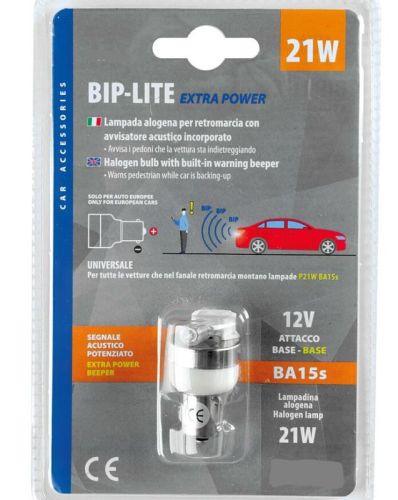 "Ampoule halogène 12V/21W avec avertisseur sonore intégré. Spécifique pour lampe inversée. Lors de l’insertion de la marche arrière, la lampe s’allume et émet simultanément un signal d’avertissement (=95 dB)"