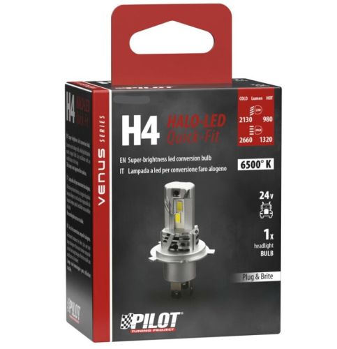 "• H4 24V Halo LED Venus Serie Quick-Fit • 15W • 1 pcs - Box • 2130-2660Lumen froid / 980-1320Lumen chaud • Très lumineuse. • Flux lumineux supérieur aux ampoules halogènes, avec une distribution lumineuse identique à celle des ampoules d'origine. Installation facile sans modification. • Puces LED de dernière génération. • Éclairage exceptionnellement puissant et longue durée de vie. • Dissipation thermique sans ventilateur. • Technologie froide : aucun besoin de ventilation ni de dissipateur thermique supplémentaire."