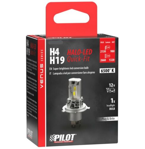 "• Ampoule LED Halo H4/H19 12 V série Venus à fixation rapide • 21 W • 1 pièce - Boîte • Flux lumineux : 2130-2660 lumens (froid) / 980-1320 lumens (chaud) • 11-18 V • Très haute luminosité. • Flux lumineux supérieur aux ampoules halogènes, avec une distribution lumineuse identique à celle des ampoules d'origine. Installation facile sans modification. • Puces LED de dernière génération. • Éclairage exceptionnellement lumineux, longue durée de vie. • Dissipation thermique sans ventilateur. • Technologie de refroidissement : aucun besoin de ventilation ni de dissipateur thermique supplémentaire. "