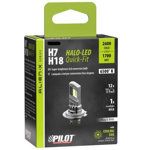 "• Ampoule LED Halo H7/H18 12V Série Alien-X à fixation rapide • 22W • 1 pièce - Boîte • 2600 lumens (froid) / 1700 lumens (chaud) • 11-18V • Très lumineuse. • Installation facile sans modification des lampes. • Puces LED de dernière génération. • Éclairage exceptionnellement puissant, longue durée de vie. • Ventilateur de refroidissement ultra-rapide."