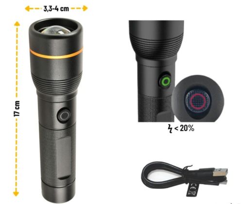 • Aluminium • 17 cm • LED 20 W 1600 lumens • 5 fonctions • Chargement par câble USB (4 heures de charge) • Batterie lithium 5000 mAh (autonomie de 2 à 5 heures)