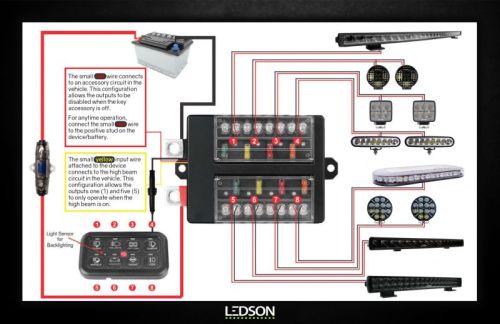 "GÉNÉRATION 2 Ledson Commander Gen2 vous permet d'allumer et d'éteindre les barres LED, les lumières auxiliaires, les lampes de travail, etc. et d'allumer et d'éteindre d'autres appareils par simple pression sur un bouton ! Le Commander de 2e génération est désormais mis à niveau avec une mémoire qui mémorise vos paramètres même après avoir coupé le contact/le véhicule. Ledson Commander vous permet d'allumer et d'éteindre les barres LED, les feux auxiliaires, les phares de travail, etc. et d'allumer et d'éteindre d'autres appareils en appuyant simplement sur un bouton ! Panneau de contrôle programmable avec 8 sorties individuelles, contrôle jusqu'à 8 unités séparément ou ensemble. Un contrôle avec rétroéclairage sélectionnable RVB inclus (avec câble de 2,5 mètres) mais vous pouvez également utiliser une application gratuite pour Android ou Apple. Ledson Commander dispose d'une entrée directe (câble jaune) pour pouvoir contrôler la barre LED/les feux auxiliaires, etc. via le signal de feux de route/feux de route analogiques du véhicule. 12V / 24V avec relais MosFet / électroniques, prise en charge de l'application pour le contrôle via Bluetooth, protection contre la surchauffe, la surcharge, les courts-circuits et la polarité. Inclus : Boîtier relais avec télécommande, câblage batterie, fusibles, 50 symboles/autocollants différents à fixer sur la télécommande, support avec vis pour boîtier relais et télécommande, notice de montage. Ledson Commander facilite le quotidien. Avec le contrôleur, vous pouvez facilement commander différents appareils. Les domaines d'utilisation ne sont limités que par votre imagination car vous pouvez contrôler tous les appareils électriques de 12V à 24V. Connectez et commandez jusqu'à huit sorties différentes avec Commander. Il peut commander des dispositifs d'éclairage tels que des feux auxiliaires, des feux de travail, des marquages ??latéraux et des voyants d'avertissement, mais également d'autres dispositifs tels que des cafetières et des micro-ondes. Les appareils peuvent être gérés séparément ou synchronisés. Par exemple, vous pouvez choisir d'avoir un contrôle synchronisé de tous les éclairages d'un véhicule, en fonction du résultat que vous recherchez. Une caractéristique unique du Commander est qu'il peut facilement être connecté à une application via Bluetooth. De cette façon, vous pouvez contrôler tous les appareils directement depuis votre téléphone, ce qui facilite l'activation et la désactivation des appareils lorsque vous êtes à l'extérieur du véhicule. Commander est très polyvalent, ce qui signifie qu'il peut être utilisé pour plusieurs véhicules différents tels que les voitures, les VUL et les camions. Le fait qu'il puisse contrôler plusieurs types d'appareils différents en même temps est un avantage, en particulier pour les véhicules tels que les camping-cars et les caravanes qui, en plus de l'éclairage, disposent également d'autres équipements électriques. L'installation de Commander est simple et rapide, ce qui signifie qu'un petit investissement de temps génère de nombreux domaines d'utilisation et d'avantages. Plus d'information: 1. Courant total maximum : 60 A (720 W à 12 V). 2. 8 interrupteurs programmables individuellement. 3. Le courant total maximum de cet appareil est de 60A. 4. Courant maximum par sortie à 12V : - Les fusibles de sortie 1 et 5 sont de 30 A - activés lorsque le câble jaune est alimenté - Les fusibles de sortie 2 et 6 sont de 20A - Les fusibles de sortie 3 et 7 sont de 10A - Les fusibles de sortie 4 et 8 sont de 5A - Si la sortie a été surchargée, une LED rouge indiquera à côté du fusible grillé 5. La puissance maximale d'une sortie ne doit pas dépasser 300 W (25 A à 12 V) 6. Bluetooth intégré pour le contrôle de l'application. 7. Protection contre la surchauffe, la surcharge, les courts-circuits, la protection de polarité. 8. Commande directe des feux de route vers le circuit 1 et le circuit 5. 9. Icônes programmables. 10. Commutateurs rétroéclairés avec couleur de rétroéclairage sélectionnable. 11. Indication LED pour surcharge/fusible cassé. 12. Chaque interrupteur peut être programmé pour trois fonctions différentes : - Basculer entre Marche/Arrêt - Basculer entre Marche/Arrêt tant que le bouton est enfoncé - Fonction stroboscopique"