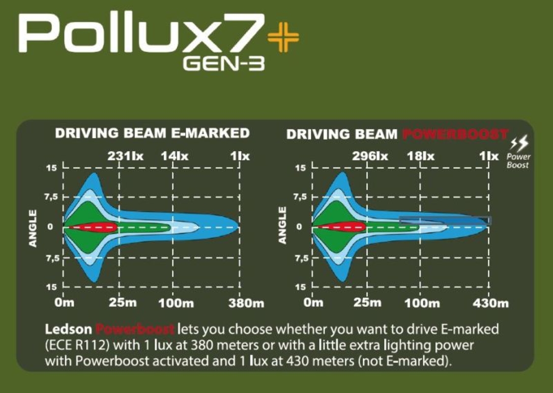 "Pollux7+ Génération 3 : Plus puissant et plus intelligent que jamais ! Avec le Pollux7+ Génération 3, optimisez votre expérience de conduite grâce à la toute dernière technologie Ledson intégrée à un phare auxiliaire ultra-performant. Son format de 18 cm (7 pouces) est particulièrement adapté aux voitures et aux véhicules plus petits, car il est légèrement plus compact que son grand frère, le Pollux9+, qui mesure 23 cm (9 pouces) de diamètre (environ 38 mm de moins). Avec une puissance de 72 W et la fonction révolutionnaire Powerboost à contrôle d'impulsions, le Pollux7+ offre une flexibilité accrue et une luminosité améliorée lorsque vous en avez le plus besoin. Le Pollux7+ offre une luminosité et une portée exceptionnelles pour une visibilité et une sécurité optimales dans toutes les conditions de conduite. Sa conception robuste lui permet de résister aux environnements les plus difficiles et de garantir des performances exceptionnelles pour de nombreuses années. Powerboost à contrôle d'impulsions : Une fluidité incomparable Le Pollux7+ Gen3 est équipé de la fonction Powerboost de Ledson, un mode de puissance supplémentaire pour les moments où vous avez besoin (ou tout simplement envie) d'une luminosité maximale. Un simple mouvement du levier des feux de route active cette luminosité impressionnante, vous permettant d'ajuster facilement l'intensité de l'éclairage auxiliaire selon vos besoins. Grâce à la nouvelle génération de Powerboost de Ledson, vous pouvez changer de mode en toute fluidité grâce à l'appel de phares, en quelques étapes simples, comme illustré ici. Remarque : Votre éclairage auxiliaire est livré en mode homologué CE. Veuillez suivre les instructions pour activer le mode Powerboost. • Homologué CE (réf. n° 30), ECE R112 / R10 / R7 (feu de position blanc) - En savoir plus sur les marquages ??CE ici • Équipé de la fonction Powerboost à impulsions • Compatible CEM (n'interfère pas avec les signaux radio) • Feu de position (4 LED) jaune-orange ou blanc xénon (choisissez la couleur souhaitée) • Faisceau de route • Portée : 380 m (1 lux), Powerboost : 430 m (1 lux) • Flux lumineux : 7 200 lumens (théorique), 5 400 lumens (réel) • Température de couleur : 5 000 K (blanc neutre) • Système optique TIR (réflexion interne totale) • Membrane d'égalisation de pression • Garantie 36 mois • Largeur : 180 mm • Hauteur : 191 mm (support inclus) • Profondeur : 48 mm • Poids : 1,2 kg • Longueur du câble : 650 mm mm • 72 W (12 LED de 6 W) • Indice de protection IP68 et IP69K (étanche à l'eau et à la poussière) • Connecteur DT (4 broches) inclus • Gestion thermique électronique • Tension : 9-36 V • Courant admissible : 4,2 A à 12 V et 2,1 A à 24 V • Surcharge : 6 A à 12 V et 3,5 A à 24 V "