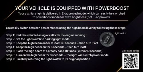 "LEDSON Pollux9+ Génération 3 (SPOT Beam) : Plus puissant et plus intelligent que jamais !! Avec le Pollux9+ Génération 3, vous améliorez votre expérience de conduite avec la dernière technologie de Ledson dans un éclairage auxiliaire rempli de fonctionnalités. Avec une puissance de sortie impressionnante de 120 W et la fonction révolutionnaire Powerboost contrôlée par impulsions, cette troisième génération de Pollux9+ offre une flexibilité accrue et une luminosité améliorée lorsque vous en avez le plus besoin. Pollux9+ Génération 3 offre une luminosité et une portée exceptionnelles pour garantir une visibilité et une sécurité supérieures dans toutes les conditions de conduite. Grâce à sa conception robuste, le Pollux9+ Génération 3 est conçu pour résister à des conditions difficiles et est prêt à offrir des performances supérieures pour les années à venir. Powerboost contrôlé par impulsions - Il n'y a pas plus fluide que cela Pollux9+ Gen3 est équipé de Ledson Powerboost, un mode de puissance supplémentaire pour les moments où vous avez besoin (ou souhaitez simplement) une luminosité maximale. Un simple mouvement du levier des feux de route active cette luminosité impressionnante, vous permettant d'ajuster facilement la puissance de l'éclairage auxiliaire en fonction de vos besoins. Avec la nouvelle génération de Powerboost de Ledson, vous pouvez changer de mode en toute transparence à l'aide des feux de route en quelques étapes simples. Remarque : Votre éclairage d'appoint est livré en mode homologué E. Veuillez suivre les instructions pour activer le mode Powerboost. Passez en mode Powerboost avec « 10+10+5 » : Cela se fait plus facilement avec « l'interrupteur d'éclairage » lorsque l'interrupteur d'éclairage est en mode arrêt ou feu de stationnement. Allumez la lumière auxiliaire pendant environ 10 secondes (entre 7 et 13 secondes) Faites clignoter rapidement la lumière auxiliaire 10 fois (dans les 10 secondes) Au onzième flash, maintenez la lumière allumée et après environ 5 secondes, la fonction Powerboost s'allumera ou s'éteindra automatiquement. TIR signifie Total Internal Reflection et signifie que toute la lumière est efficacement réfléchie et dirigée avant d'être émise par le réflecteur. La lumière de déversement (la lumière qui n'est pas dirigée mais disparaît « floue » de l'éclairage sans réellement servir à quoi que ce soit) est minimisée. Un réflecteur traditionnel dirige et concentre la majeure partie de la lumière, mais pas la totalité ; Pollux 9+ dispose de ces réflecteurs TIR pour un maximum de lumière. • Marqué E (réf. 37.5 pour Driving Beam, réf. 50 pour Spot Beam), ECE R112 / R10 / R7 (feu de position blanc) • Équipé d'un Powerboost contrôlé par impulsion • EMC sécurisé (n'interfère pas avec les signaux radio) • Avec feu de position (4 LED) jaune-orange ou blanc xénon (connectez la couleur que vous préférez) • Modèle lumineux « Faisceau de route » • Portée du faisceau de route : 407 m (1 lux), Powerboost : 659 m (1 lux) • 4 200 lumens (théorique), 3 500 lumens (réel) • Powerboost 13 000 lumens (théorique), 10 500 lumens (réel) • Température de couleur 5 000 K (blanc neutre) • Système optique TIR (Total Inner Reflection) • Membrane d'égalisation de pression • Garantie de 36 mois • Largeur : 218 mm • Hauteur : 234,5 mm (support compris) • Profondeur : 68,5 mm • Poids : 1,9 kg • Longueur du câble : 650 mm • Connecteur à 4 broches Rouge : Lumière supplémentaire (+) Noir : Feu supplémentaire / Feux de position (- masse) Blanc : feux de position (+) lumière blanche Jaune : feux de position (+) feu jaune-orange REMARQUE : Le connecteur DT ne doit pas être coupé, car cela augmente le risque de dommages causés par l'humidité et annule la garantie."