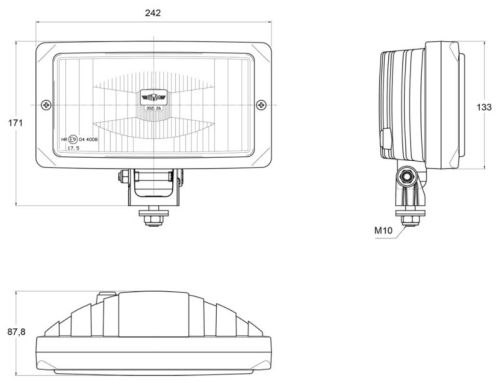 "Couleur Blanc Montage Boulon M10 Type Feux de route longue portée Source lumineux Halogène Couleur lentille Transparent Côté montage Devant Largeur mm 242 mm Hauteur mm 171 mm Épaisseur mm 88 mm Homologation ECE R8 Emballé par 1 Emballage Emballage POS Bon à savoir Ampoule H3 + T10 (pas inclus) Poids (kg) 1,102 Kg "