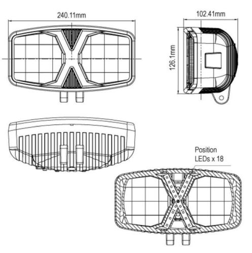 "La lampe LED-X Drving & Position est conçue à l'aide d'une technologie de pointe. Transformez le look de votre véhicule avec le style exclusif du LED-X qui donne une présence distinctive sur la route. En utilisant des LED fiables et efficaces à haut rendement pour un éclairage supérieur, vous pouvez compter sur le LED-X pour un rendement lumineux élevé et une visibilité maximale. Avec une conception robuste et durable, cette lampe de conduite et de position à LED a été rigoureusement testée pour se conformer aux normes de l'industrie et de la CEE. Logé dans un aluminium moulé sous pression solide et une lentille en polycarbonate rendant cette lampe résistante à la corrosion, aux chocs et aux vibrations, avec un indice de protection IP68K impressionnant. Ces lampes ont une connexion plug and play intégrée assurant une installation facile avec un minimum de temps et d'effort. 12/24 Volts 33.6 Watts* High Beam: 30W, Position: 3.6W Lumens: High Beam: 1610, Position: 302 20 LEDs Rated IP69K 400M Light Distance Polycarbonate Lens Die Cast Aluminium Housing Stainless Steel Bracket Mount / M10 Bolt Plug-In Connector Dimensions: 240*126*102.5mm ECE R7/R10/R112 Operating Temperature: -40C to +60C Nominal Current @12V 2.08A(Driving) 0.42A(Position) Nominal Current @24V 1.17A(Driving) 0.23A(Position)"