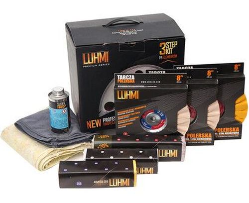 Contient: • 3x pâte à polir Amglos différentes étapes • 3x meules de polissage Amglos différentes étapes • 1x Luhmi Amglos super finition 250gr • Chiffons de nettoyage ATTENTION ! NE convient PAS aux NOUVELLES roues Durabright !