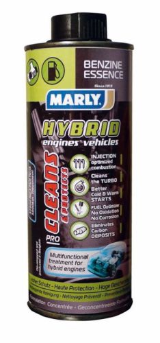 "Le traitement Marly Hybrid Petrol est spécialement développé pour les moteurs thermiques des véhicules hybrides. Les démarrages à froid, les arrêts répétés et le fait que le carburant reste plus longtemps dans le réservoir (oxydation) peuvent être à l'origine de divers problèmes. Le traitement stabilise et protège le carburant.Il limite et disperse la condensation et évite les dommages causés par l'oxydation et la corrosion dans le système d'injection.Il nettoie les dépôts dans les têtes d'injection, le circuit de carburant, les soupapes d'admission et les chambres de combustion.Il assure également une atomisation optimale lors de la phase d'injection afin d'améliorer la combustion.Une utilisation régulière optimise les performances du moteur, réduit la consommation de carburant et les émissions nocives, et prolonge la durée de vie des systèmes d'injection et de post-traitement des gaz d'échappement. UTILISATION : Avant de faire le plein, verser un bidon de 375 ml directement dans le réservoir de carburant.Répéter le traitement en moyenne tous les 5 000 km ou tous les six mois."