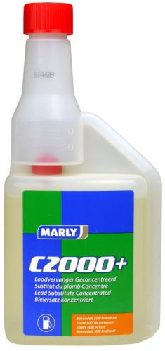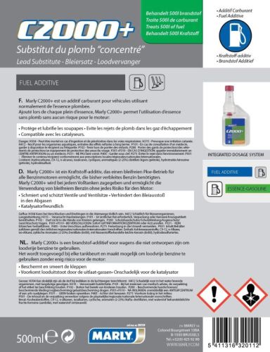 "Marly C2000+ (500 ml) substitut de plomb, traite 500 litres de carburant. Substitut de plomb très concentré, utilisé systématiquement, offrant une protection similaire à celle offerte par l'essence au plomb. Marly C2000+ ne contient pas de plomb, mais du potassium (K) qui, comme le plomb, se transforme lors de la combustion en un lubrifiant solide (oxyde de potassium) qui forme un film protecteur sur les sièges de soupapes. Dosage : mesurer la quantité à ajouter au carburant à chaque plein à l'aide du doseur, soit 25 ml pour 25 litres d'essence sans plomb. (1 ml par L d'essence) • Protège les soupapes et les sièges de soupapes. • Idéal pour les véhicules anciens, pas pour l'essence sans plomb. • Compatible avec tous les types d'essence (98-E5 ou 95-E10). • Dosage : 1 ml par litre d'essence. 500 ml traite 500 l d'essence. "