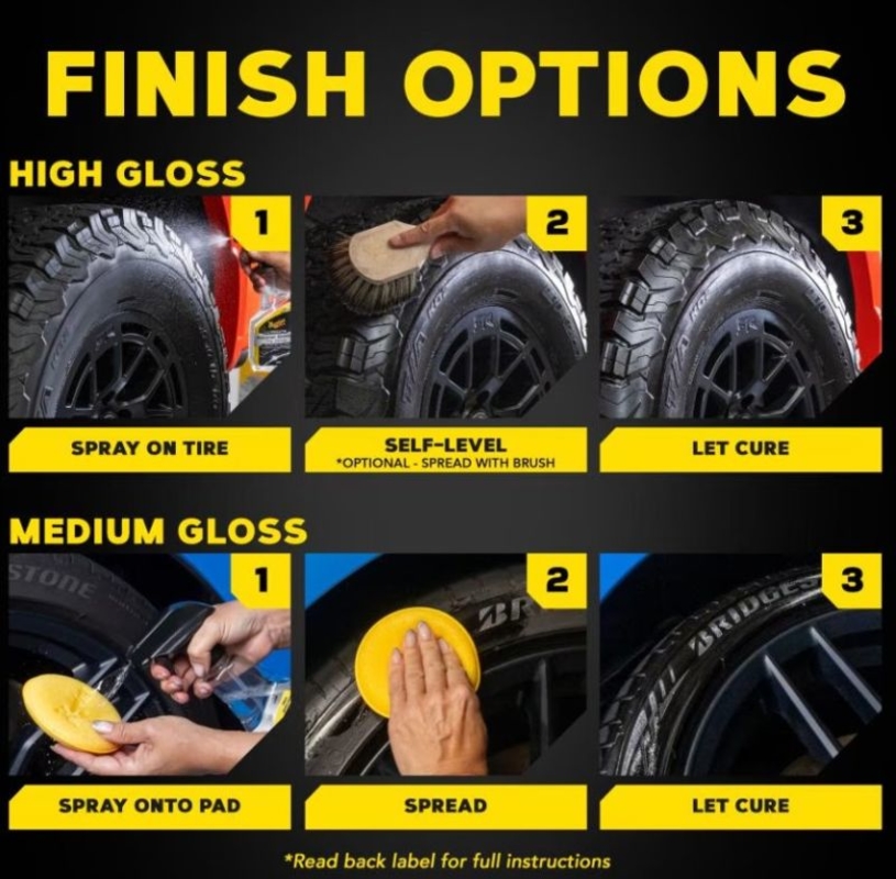 "Cette formule haut de gamme est l'un des produits de lustrage pour pneus les plus brillants de Meguiar's. Grâce à sa chimie avancée de polymères synthétiques, ce spray lustrant liquide pour pneus offre une profondeur extrême et un éclat exceptionnel. Pour un brillant intense, vaporisez directement sur le pneu et laissez sécher. Pour un brillant moyen, vaporisez simplement le produit sur un applicateur, appliquez-le uniformément sur le pneu et laissez sécher avant de prendre la route. Si vous recherchez un produit de lustrage haut de gamme offrant une adhérence exceptionnelle pour un brillant durable et un effet mouillé qui sublime l'apparence de votre voiture, alors le spray lustrant pour pneus Ultimate Insane Shine est fait pour vous ! BIEN AGITER AVANT L'EMPLOI. Utiliser sur un pneu propre et sec, dans un endroit bien aéré. Brillance élevée : Vaporiser une couche uniforme sur les pneus et laisser sécher. Essuyer les jantes. Brillance moyenne : Vaporiser sur un applicateur et appliquer sur les pneus. Essuyer le produit s'il entre en contact avec les jantes. CONSEIL : Laisser sécher le produit sur les pneus avant de rouler. Une seconde application peut être nécessaire sur les pneus usés, car ils absorbent rapidement le produit. REMARQUE : Utiliser uniquement comme indiqué. Ne pas appliquer sur les surfaces peintes ni sur les panneaux en plastique. Essuyer les projections sur les panneaux en plastique si nécessaire pour éviter les taches. NE PAS UTILISER sur les pneus ou les selles de motos, vélos ou autres deux-roues. Éviter de vaporiser autour des moteurs de frein, des tambours de frein ou des pédales de frein. L'application sur ces surfaces peut les rendre glissantes. Ne pas appliquer le produit sur la bande de roulement du pneu et éviter tout contact avec celle-ci. Enlever immédiatement le produit du ciment ou de l'asphalte à l'aide d'un produit nettoyant afin d'éviter les taches et les risques de glissance. Entreposer et transporter en toute sécurité et en position verticale. "