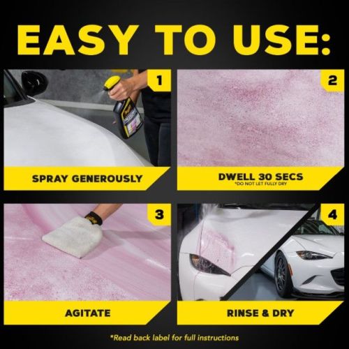 "Vous souhaitez redonner de l'éclat à votre voiture ? Avec l'Ultimate Iron Remover de Meguiar's, vous pouvez éliminer sans effort les particules de fer incrustées, les dépôts industriels et la poussière de frein de la peinture, du verre et du chrome. Cette formule puissante et légèrement acide change de couleur à mesure qu'elle dissout les contaminants, afin que vous puissiez voir exactement où elle agit. Le résultat ? Un vernis lisse et transparent prêt à être traité ultérieurement. Ce produit est simple d'utilisation : vaporisez-le sur la surface, laissez agir 30 secondes, utilisez un gant de toilette si nécessaire puis rincez abondamment. Il est sans danger pour diverses surfaces et constitue un incontournable pour tout passionné de voiture qui s'efforce d'obtenir les meilleurs résultats. • Élimine efficacement les particules de fer et la poussière de frein • Formule au pH équilibré, sans danger pour la peinture, le verre et le chrome • Devient violet à mesure que les contaminants se dissolvent • Prépare la surface pour d'autres traitements tels que le polissage ou le cirage • Facile à utiliser : vaporiser, travailler, rincer 1. Assurez-vous que la voiture est fraîche et à l'ombre. 2. Vaporisez une quantité généreuse d'Ultimate Iron Remover sur la surface souhaitée. 3. Laissez le produit agir pendant 30 secondes. Il deviendra violet en dissolvant les particules de fer. 4. Si nécessaire, utilisez un gant de toilette humide pour travailler délicatement le produit et éviter qu'il ne sèche. 5. Rincer soigneusement la surface avec un jet d'eau puissant. 6. Séchez la voiture pour éviter toute trace d'eau. Remarque : Ne pas utiliser sur des surfaces chaudes ou en plein soleil. Testez d'abord le produit dans une zone peu visible pour garantir la compatibilité."