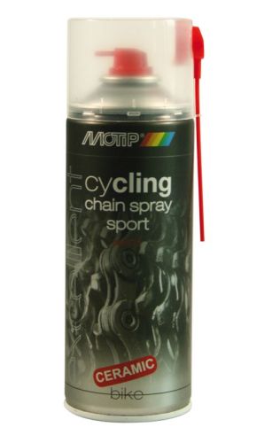 "Lubrifiant de haute qualité pour le traitement des chaînes et des pignons de vélo. Cycling Chain Spray Sport a un coefficient de friction très faible pour une résistance minimale, tout en conservant les propriétés de graissage, même en charge élevée. Spécialement conçu pour les chaînes et les pignons des vélos de course, des vélos tout terrain, et des VTC. C’est un produit hydrofuge, résistant aux intempéries, qui prévient l’usure et réduit l’adhésion de la saleté. Dans des conditions extrêmes, nous vous recommandons le MoTip Cycling Chain Spray Ultra. "