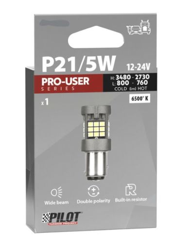 "Série Pro-User 12/24 V - (P21/5 W) - BAY15d - 1 pièce - Boîte - Blanc - Double polarité - Résistance intégrée Ampoules LED de dernière génération. Développées avec la technologie Halo-Led et miniaturisées, elles remplacent les ampoules à incandescence classiques avec culot pour une utilisation à l'intérieur comme à l'extérieur du véhicule. • LED à faible émission de chaleur • Flux lumineux très élevé (lumens), à froid comme à chaud • Puissance élevée en watts • Compatible avec les véhicules équipés d'un système CAN-Bus (empêche l'allumage du témoin lumineux) • Dimensions : 20,5 x 48,2 mm"