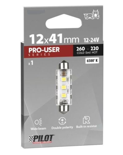"Série Pro-User 12/24 V - 12,5 x 41 mm - SV8,5-8 - 1 pièce - Boîte - Blanc - Double polarité - Résistance intégrée Ampoules LED de dernière génération. Développées avec la technologie Halo-Led et miniaturisées, elles remplacent les ampoules à incandescence classiques avec culot pour une utilisation à l'intérieur comme à l'extérieur du véhicule. • LED à faible émission de chaleur • Flux lumineux très élevé (lumens), à froid comme à chaud • Puissance élevée en watts • Compatible avec les véhicules équipés d'un système CAN-Bus (empêche l'allumage du témoin lumineux) • Dimensions : 12,5 x 41 mm"
