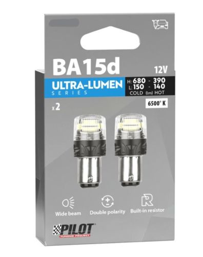 "Série Ultra-Lumen 12 V - (BA15d) - BA15d - Lot de 2 - Blanc - Double polarité - Résistance intégrée Lampes LED de dernière génération. Développées avec la technologie Halo-Led et miniaturisées, elles remplacent les ampoules à incandescence classiques avec culot pour une utilisation à l'intérieur comme à l'extérieur du véhicule. • LED à faible émission de chaleur • Flux lumineux très élevé (lumens), à froid comme à chaud • Puissance élevée en watts • Compatible avec les véhicules équipés d'un système CAN-Bus (empêche l'allumage du témoin lumineux) • Dimensions : 20,4 x 44,6 mm"