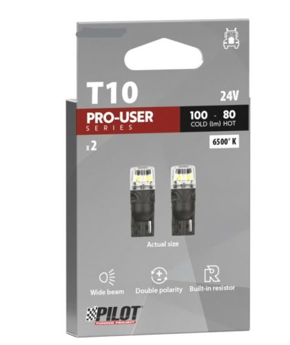 "Série Pro-User 24 V - (T10) - W2,1 x 9,5 d - 2 pièces - Boîte - Blanc - Double polarité - Résistance intégrée Ampoules LED de dernière génération. Développées avec la technologie Halo-Led et miniaturisées, elles remplacent les ampoules à incandescence classiques avec culot pour une utilisation à l'intérieur comme à l'extérieur du véhicule. • LED à faible émission de chaleur • Flux lumineux très élevé (lumens), à froid comme à chaud • Puissance élevée en watts • Compatible avec les véhicules équipés d'un système CAN-Bus (empêche l'allumage du témoin lumineux) • Dimensions : 10,2 x 27,8 mm"