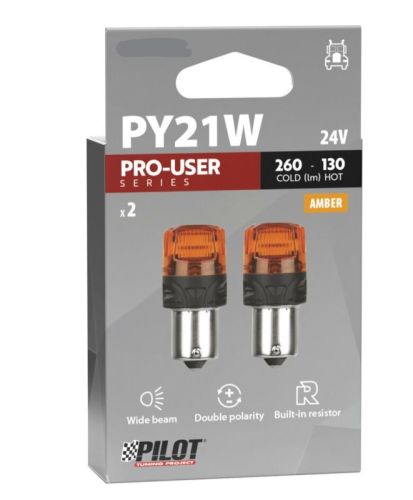 "Série Pro-User 24 V - (PY21W) - BAU15s - Lot de 2 - Ambre - Double polarité - Résistance intégrée Ampoules LED de dernière génération. Développées avec la technologie Halo-Led et miniaturisées, elles remplacent les ampoules à incandescence classiques avec culot pour une utilisation à l'intérieur comme à l'extérieur du véhicule. • LED à faible émission de chaleur • Flux lumineux très élevé (lumens), à froid comme à chaud • Puissance élevée en watts • Compatible avec les véhicules équipés d'un système CAN-Bus (empêche l'allumage du témoin lumineux) • Dimensions : 20,4 x 44,6 mm"