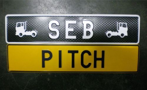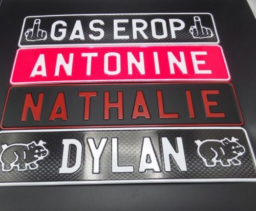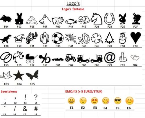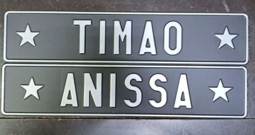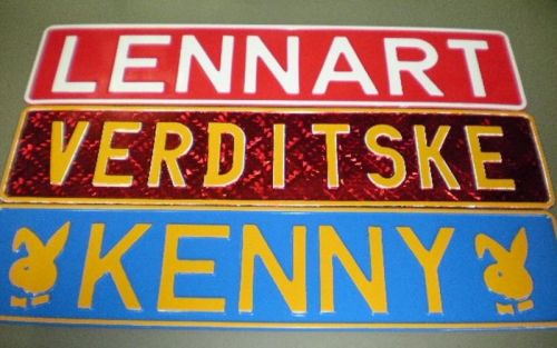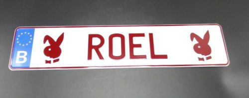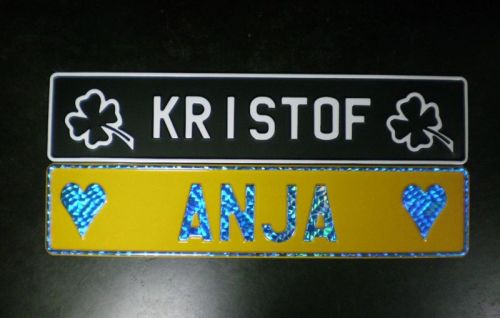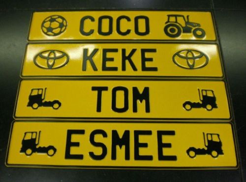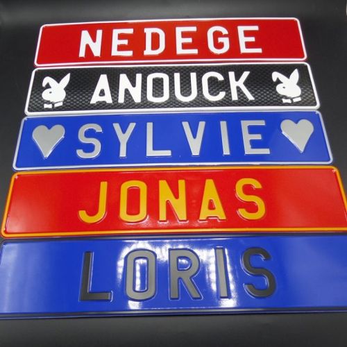 "Couleur du texte & du fond à choisir dans l'annexe. Couleurs du texte: 1e ligne, couleurs du fond: 2e & 3e ligne. Logos à choisir dans l'annexe. Max. 11 lettres (plaque sans logos) Max. 9 lettres (plaque avec 1 logo) Max. 7 lettres (plaque avec 2 logos)"