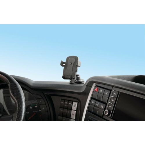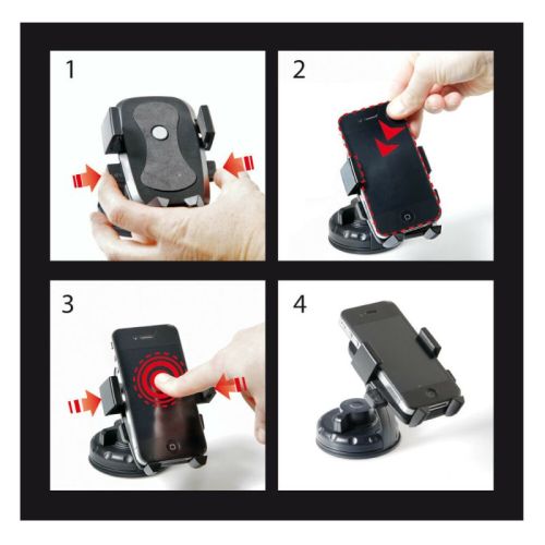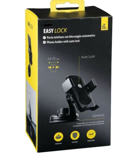 "Easy-Lock, support de téléphone avec verrouillage automatique Verrouillage automatique lorsque le téléphone est positionné sur le support. Montage facile et rapide. Angle réglable. Ventouse avec base collante pour assurer une forte adhérence sur le tableau de bord, le pare-brise et d'autres surfaces. Le tampon adhésif peut être nettoyé à l'eau du robinet. Aucun résidu Pour téléphones max 75 mm"