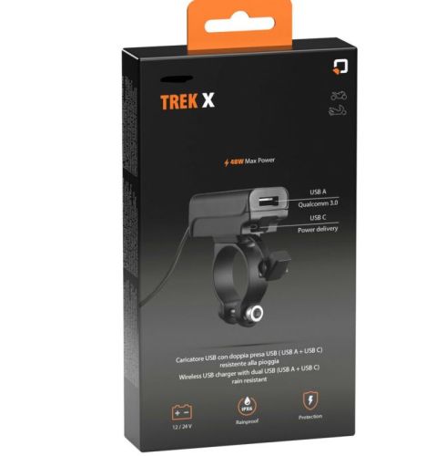 "Trek X, chargeur USB avec double prise USB (USB A + USB C) étanche à la pluie Puissance maximale de 48 W : USB A 18 W MAX / USB C 30 W. Câble de 180 cm avec connecteur SAE et fusible pour connexion directe à la batterie. Il est possible de connecter des mainteneurs de batterie utilisant le connecteur SAE. 3 modes de fixation : support guidon, support à vis ou adhésif double face et sous le support DuoLock. Protection contre les courts-circuits, la surchauffe, les surcharges et les surtensions."