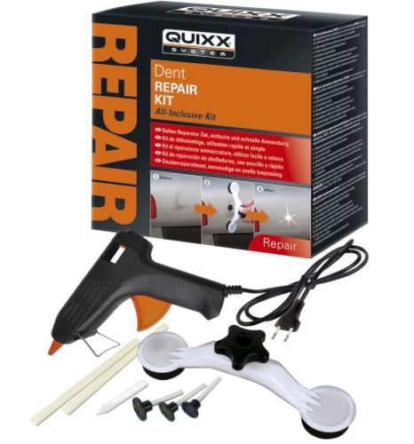 "Le kit de débosselage QUIXX développé par des professionnels de la carrosserie vous permet de rapidement remédier aux problèmes liés aux bosses à un prix abordable. Si les bosses n’ont pas abîmé la peinture, le kit de débosselage QUIXX permet même aux amateurs de procéder au débosselage en 3 étapes simples. Caractéristiques: - Débosselage à faire soi-même avec une qualité professionnelle - Élimine les bosses sans abîmer la peinture - Convient à la plupart des bosses dans les zones plate de carrosserie de voiture - Utilisation rapide et simple - Développé et utilisé par des professionnels de la réparation - Évite les réparations onéreuses et la dévalorisation - Kit tout compris : contient tout le nécessaire pour la réparation Contenu: 1 Pont de réparation 3 Ventouses de traction de différentes tailles 1 Pistolet à colle chaude 2 Bâtons de colle spéciale 1 Pointe en plastique pour l’élimination des restes de colle 1 Feuille d'instruction"