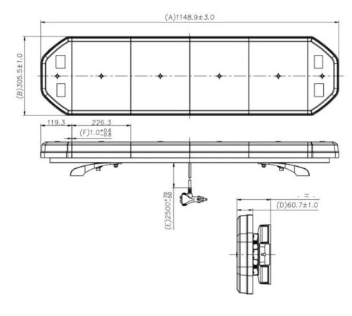 12 - 24 Volts 75W 200 x 1W LED's 10 Flash Patterns IP69K Rated ECE Reg 10 | Reg 65 | Class 2 Clear Polycarbonate Lens Plastic Bracket / Metal Bracket 360° Light Distribution Cigarette Plug Connection 2.5m Cable Dimensions: 1150*305.5*130mm Operating Temperature: -40? to +65? Nominal Current @ 12V: 6.8 A Nominal Current @ 24V: 3.0 A