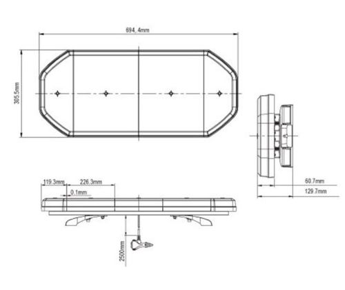 12 - 24 Volts 136W 136 x 1W LED's 10 Flash Patterns IP69K Rated ECE Reg 10 | Reg 65 | Class 2 Clear Polycarbonate Lens Plastic Bracket / Metal Bracket 360° Light Distribution Cigarette Plug Connection 2.5m Cable Dimensions: 695*305.5*130mm Operating Temperature: -40? to +65? Nominal Current @ 12V: 6 A Nominal Current @ 24V: 2.5 A