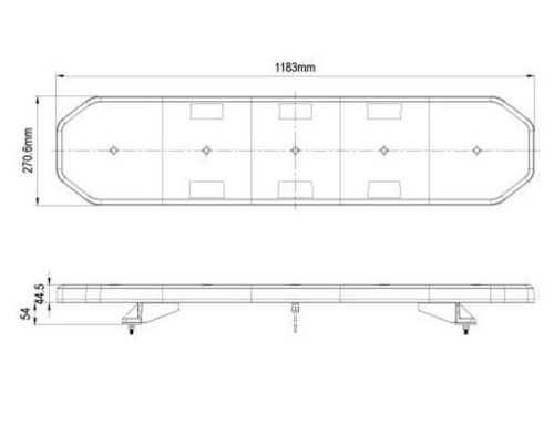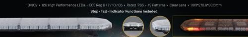 "• 10/30 V • 126 W (126 x 1 W) • 126 LED hautes performances (90 LED d'avertissement orange + 24 LED d'indication orange + 12 LED rouges d'arrêt/arrière) • Courant nominal @ 12V 7A • Courant nominal @ 24V 3.5A • 19 modèles de flash (2HZ - 4HZ) • Câble 560 x Ø5,5 mm • Support de fixation PC/métal • Lentille PC résistante aux UV (transparente) • Boîtier PC • Base en aluminium moulé sous pression • Fonctions : avertissement/arrêt orange, queue, indicateur • Classé IP65 • ECE Reg 6 | 7 | 10 | 65 • Dimensions : 1183 x 270,6 x 98,5 mm • Température de fonctionnement : -20 °C à +65 °C"