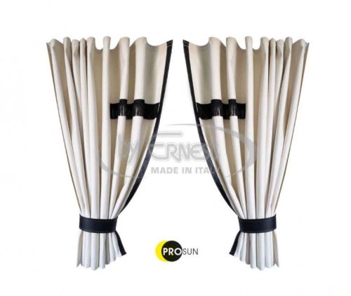 • Rideaux BEIGES • Fini avec un bracelet en cuir beige • Hauteur 2x 100 cm • Longueur 2x 215 cm • 2 embrasses rideaux cuir beige • Sans franges • Crochets pour suspendre les rideaux inclus • Patins pour camion ferroviaire NON inclus
