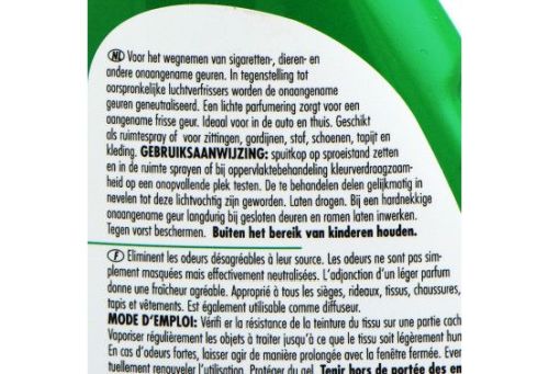 "Le destructeur d'odeurs! Elimine les odeurs de nicotine,d'animaux et autres odeurs désagréables. Assure une fraîcheur durable."