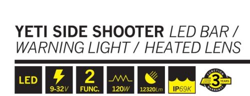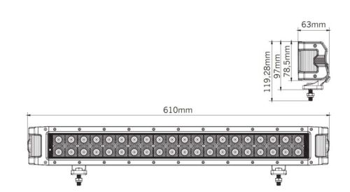 Type of LED Osram PCS LED´s 40pcs*5w OSRAM LEDS+8pcs*OSRAM 3030 LEDs+8pcs 3030 amber LEDs Voltage (V DC) 9-32V DC Theoretical effect (w) 12V 120 Theoretical effect (w) 24V 120 Consumption (w) 12V 103 Consumption (w) 24V 95 Consumption specific function (w) 12V Heated lens: 20 Consumption specific function (w) 24V Heated lens: 20 Patterns 1 Functions Work light Warning light Heated lens Theoretical lumen 12320 Actual lumen 7286 1 LUX @ m 205 Kelvin 6000 IP-class 69K Colour housing Black Colour lens Clear Colour LED´s White/amber Beam pattern Flood Position light No Connection Cable Cable length (mm) 970 Material bracket Alu firm bracket Material housing/chassi Aluminium Material lens Polycarbonate Length (mm) 610 Depth (mm) 63 Height (mm) 78.5 Height including bracket (mm) 97 Operating temperature -20°C – +40°C ADR-approved No E-approved No EMC ECE R10