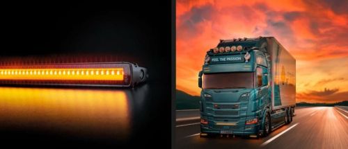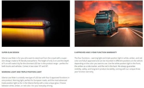 Type of lamp LED Type of LED White:OSRAM Red:ZeMe Amber:Refond PCS LED´s 105 Voltage (V DC) 10-32V DC Theoretical effect (w) 12V White position light: 45W Amber position light: 22.5W Red position light:22.5W Warning light: 45W Theoretical effect (w) 24V White position light: 45W Amber position light: 22.5W Red position light:22.5W Warning light: 45W Consumption specific function (w) 12V White position light: 8W Amber position light: 4.2W Red position light:6.5W Warning light: 16.2W Consumption specific function (w) 24V White position light: 8.7W Amber position light: 4.9W Red position light:7W Warning light: 17.9W Patterns 4 Functions White position light amber position light red position light warning light. IP-class 67/69K Colour housing Black Colour lens Clear Colour LED´s White red amber Position light White red amber Connection Cable Cable length (mm) 2500 Material bracket ADC12 Material housing/chassi Aluminium Material lens Polycarbonate Length (mm) 766 Depth (mm) 50.4 Height (mm) 30.9 Height including bracket (mm) 42.9 Operating temperature -30°C – +65°C ADR-approved No E-approved Yes According to regulation ECE R148 EMC ECE R10