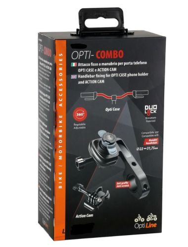 "Opti Combo, fixation de guidon avec support de came d'action • Universel pour guidons de Ø 22 à 31,75 mm. • Entièrement réglable: permet l'utilisation des accessoires verticalement et horizontalement. • Compatible avec tous les supports Opti Line (Notre ref. 03398704 / 03398705) • Système de fixation rapide Duo Lock"