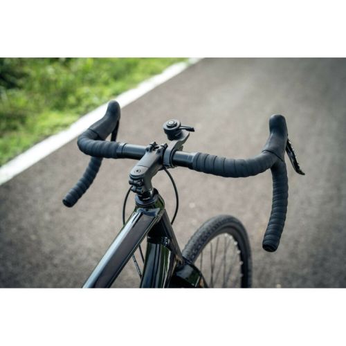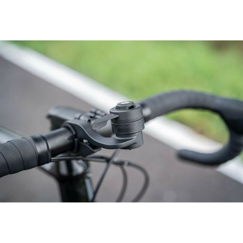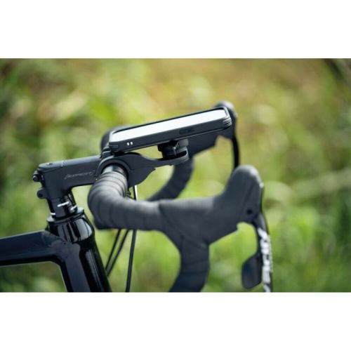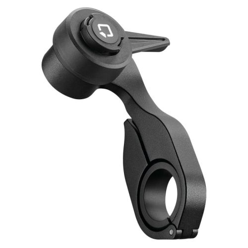 "Outfront Pro, support de téléphone discret pour guidon de vélo Réversible, peut être installé à droite ou à gauche du tube de direction. Structure en aluminium anodisé noir. Compatible avec les guidons de 22 à 35 mm (non compatible avec les guidons coniques ou non ronds). Système de fixation rapide DuoLock 2.0."