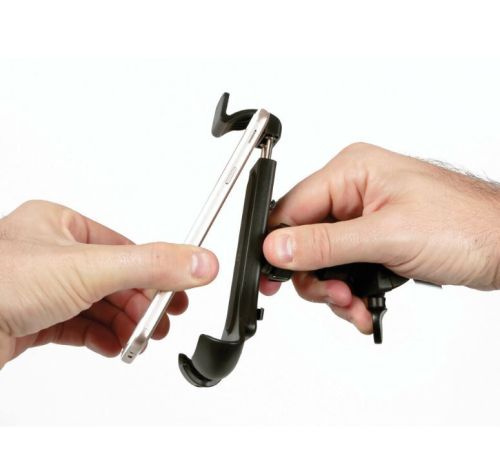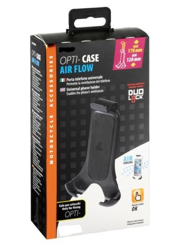 "Opti Case, support de téléphone universel • Entièrement réglable pour un meilleur angle de vue. • Active la ventilation du téléphone. • Compatible avec les appareils de 120 mm à 170 mm de hauteur. • Câble de sécurité inclus. • Inserts caoutchoutés antidérapants et anti-rayures. • Bracelet de sécurité en silicone. • N'obstrue pas le port de recharge • Spécifique pour les fixations de ligne OPTI (Notre ref. 03398701/03398702/03398703 -> requis pour montage)"
