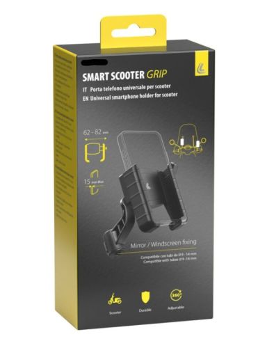 "Smart Scooter Grip, support universel pour smartphone pour trottinette Compatible avec les tubes de Ø 9 à 14 mm Permet la ventilation du téléphone afin de réduire la surchauffe Pour smartphones de 62 à 82 mm de large et 15 mm d'épaisseur Entièrement réglable pour un meilleur angle de vue Inserts caoutchoutés antidérapants et anti-rayures Câble de sécurité inclus"