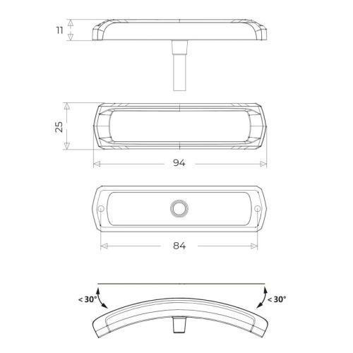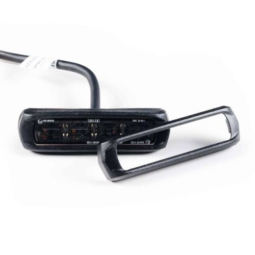 "Ce flash à LED compact est conçu pour être monté sur les véhicules où la signalisation est essentielle. Grâce à son boîtier flexible en silicone avec un rayon de courbure jusqu'à 30°, il s'adapte aux surfaces légèrement incurvées. Le montage en surface est facilité par les supports de fixation fixes et flexibles inclus. Ses dimensions de 94 x 25 x 11 mm rendent ce gyrophare LED idéal pour les applications où l'espace de montage est limité. Il fonctionne sur une tension de 12 à 24 V et est fourni avec un câble de connexion de 200 cm à extrémité dénudée. La lentille est en polycarbonate résistant aux chocs. Ce modèle est conforme aux normes CE, ECE-R10 et ECE-R65 Classe 2 et possède un indice de protection IP69K, ce qui le rend adapté aux environnements exigeants des transports, des services d'urgence et des chantiers. Avantages de cette série : – Flash flexible avec un rayon de courbure de 30° – Livré de série avec des supports de fixation fixes et flexibles – Câble de connexion pratique de 200 cm – Entièrement certifié Tension : 12-24 V Type de fonctionnement : Clignotant Certification : CE, ECE-R10, ECE-R65 Classe 2 Garantie : 5 ans Compatible avec : 4x4, remorque, véhicule utilitaire, excavatrice, véhicules d'urgence, tracteur, camion Dimensions : 94 x 25 x 11 mm Forme : Rectangulaire Entraxe : 84 mm Image lumineuse : Signalisation Couleur : Orange Fonction du signal : Clignotant Nombre de modes de clignotement : 14 Type de fonctionnement : Clignotant Nombre de LED : 4 Matériau du boîtier : Silicone Couleur du boîtier : Noir Matériau de la lentille : Polycarbonate Couleur de la lentille : Noir mat Connecteur : Extrémité filetée ouverte Longueur du câble : 20 cm Indice de protection : IP69K Montage : En saillie"