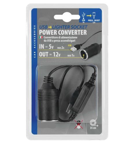 "Il permet d'utiliser des appareils avec prise 12V sur les voitures avec uniquement le port USB (chargeurs de batterie, caméras, banques d'alimentation, lumières LED, etc.). Vérifiez que l'appareil que vous souhaitez connecter ne dépasse pas 1A de consommation Puissance d'entrée du port USB 5 V : 2 A max. Puissance de sortie prise électrique 12V : 1A max"