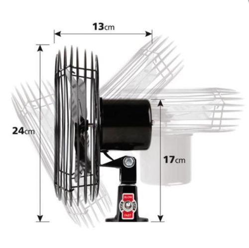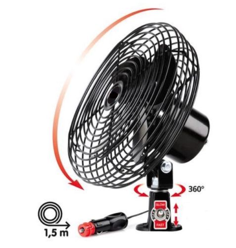 •Noiseless. •2 speed low/fast. •Metal structure. •With swivel joint for an easy adjustment of airflow-direction. •Fits standard and DIN sockets. •Fitting by screws. •150 cm cable.