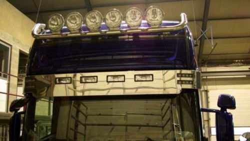"Visière en inox poli , avec 2 découpes pour feux de position à gauche et à droite, 4 découpes pour longue portée au milieu. Les côtes sont en hauteur 205mm la descente est devant la pare brise sur 264mm. Convient pour Scania Topline et Highline. Fourni avec instructions et matériel de montage. Avec certificat de conformité !"