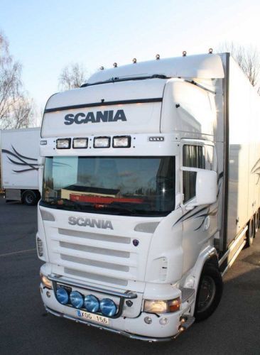 Trous prévus pour 4 LP & 2 feux de position. 8cm plus large que la visière d'origine Scania. En plastique. Cabine Topline.